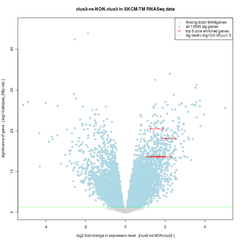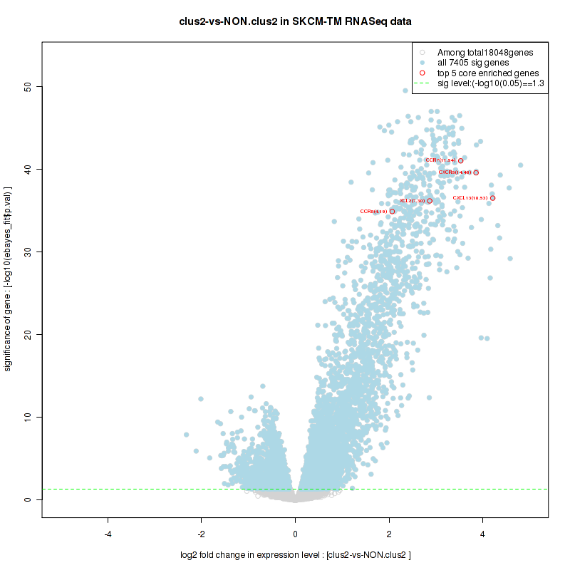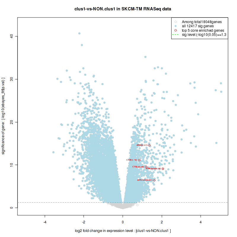 Figure S58. Get High-res Image For the top 5 core enriched genes in the pathway: KEGG NEUROACTIVE LIGAND RECEPTOR INTERACTION, this volcano plot shows how much they are up/down-regulated and significant. The significance was calculated by empirical bayesian fit