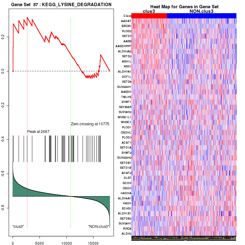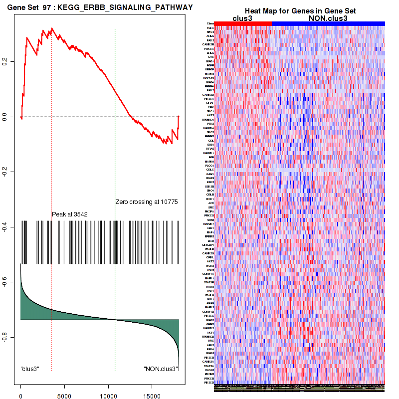 Table S1. Get Full Table This table shows a Running Enrichment Score (RES) of each gene in this pathway, that is, the enrichment score at this point in the ranked list of genes. All genes are ranked by Signal-to-Noise (S2N), a measure of similarity as default and are used to obtain ES matrix of all genes. In this way, GSEA tool uses expression pattern of not only overlapped genes but also not-overlapped genes to produce ES matrix.