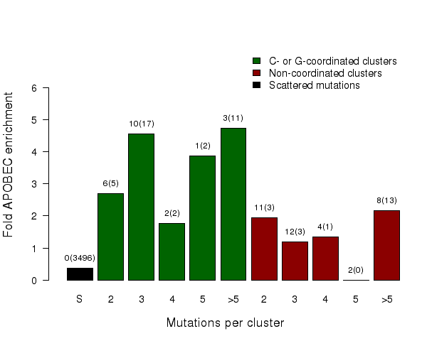Figure 9.  Get High-res Image Fold enrichment of the APOBEC mutation signature in clusters of different sizes of two categories – C- or G-coordinated or non-coordinated as well as in non-clustered (scattered) mutations. Smaller clusters usually show less enrichment because they have a higher chance to be formed by random mutations that occurred in close vicinity to each other. Values above the bars display the total number of mutation clusters in each class and in parentheses the total numbers of APOBEC signature mutations in a category. Values for fold enrichment as well as mutation and mutation cluster counts are taken from the following output files which can be downloaded from firehose_get (https://confluence.broadinstitute.org/display/GDAC/Download):