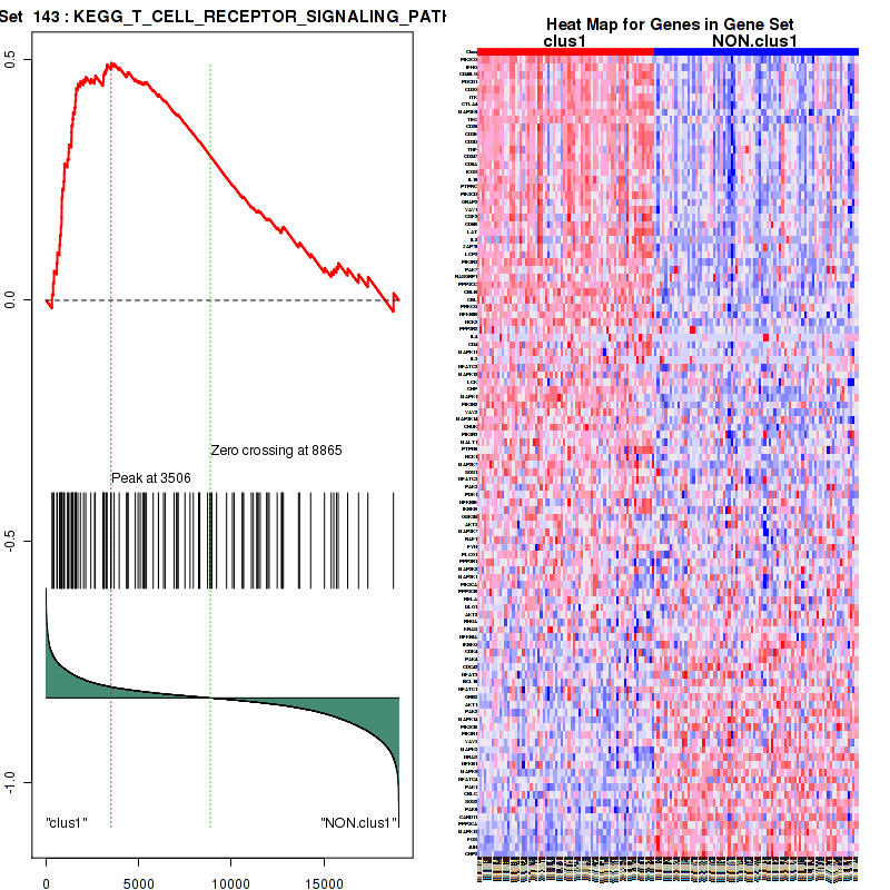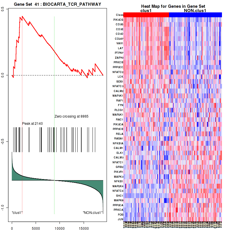 • Top enriched gene sets are BIOCARTA NKT PATHWAY, BIOCARTA TCR PATHWAY, KEGG BASE EXCISION REPAIR, KEGG HOMOLOGOUS RECOMBINATION, KEGG ANTIGEN PROCESSING AND PRESENTATION, KEGG CYTOSOLIC DNA SENSING PATHWAY, KEGG HEMATOPOIETIC CELL LINEAGE, KEGG NATURAL KILLER CELL MEDIATED CYTOTOXICITY, KEGG T CELL RECEPTOR SIGNALING PATHWAY, KEGG B CELL RECEPTOR SIGNALING PATHWAY