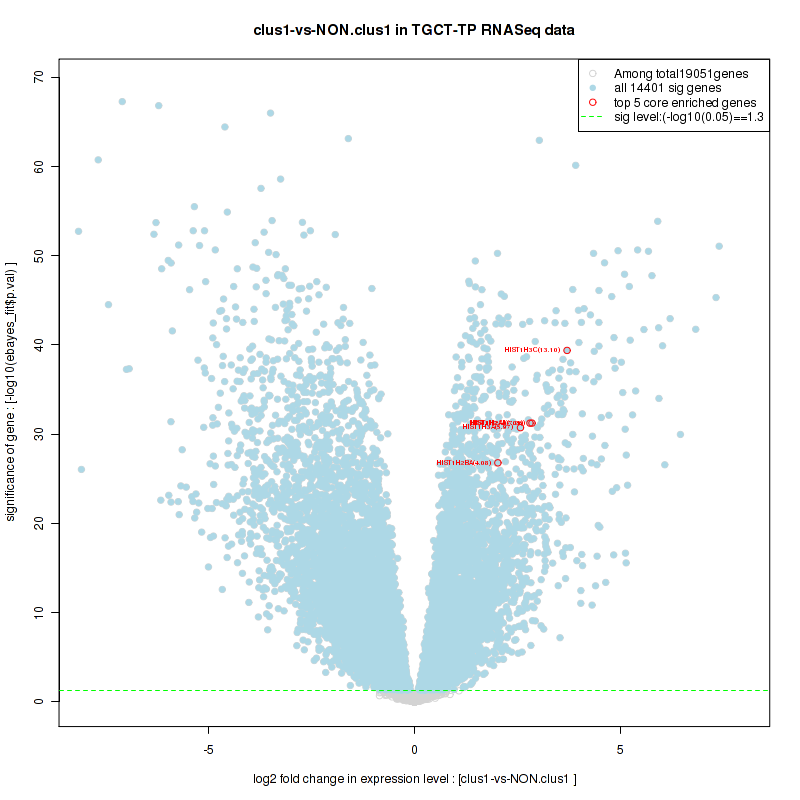 Figure S60.  Get High-res Image For the top 5 core enriched genes in the pathway: KEGG WNT SIGNALING PATHWAY, this volcano plot shows how much they are up/down-regulated and significant. The significance was calculated by empirical bayesian fit
