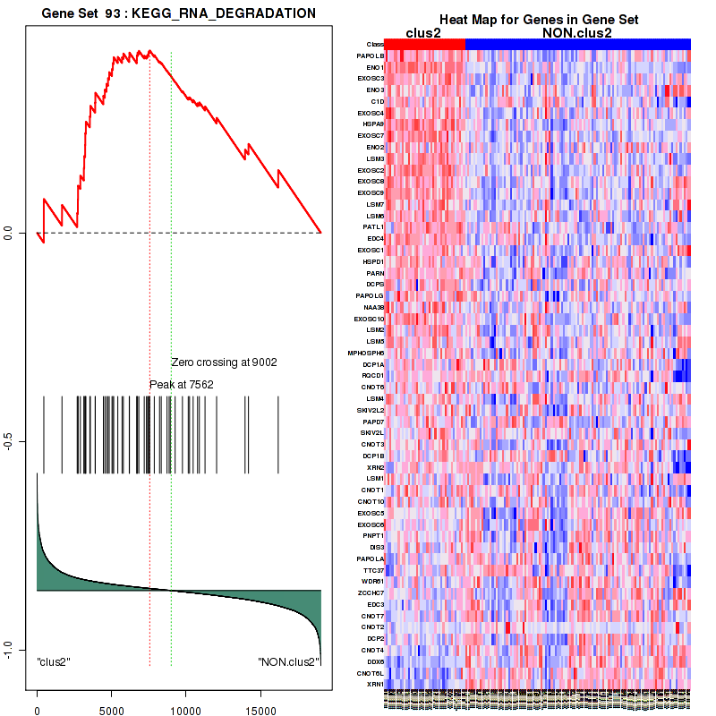 Table S30.  Get Full Table This table shows a Running Enrichment Score (RES) of each gene in this pathway, that is, the enrichment score at this point in the ranked list of genes. All genes are ranked by Signal-to-Noise (S2N), a measure of similarity as default and are used to obtain ES matrix of all genes. In this way, GSEA tool uses expression pattern of not only overlapped genes but also not-overlapped genes to produce ES matrix.