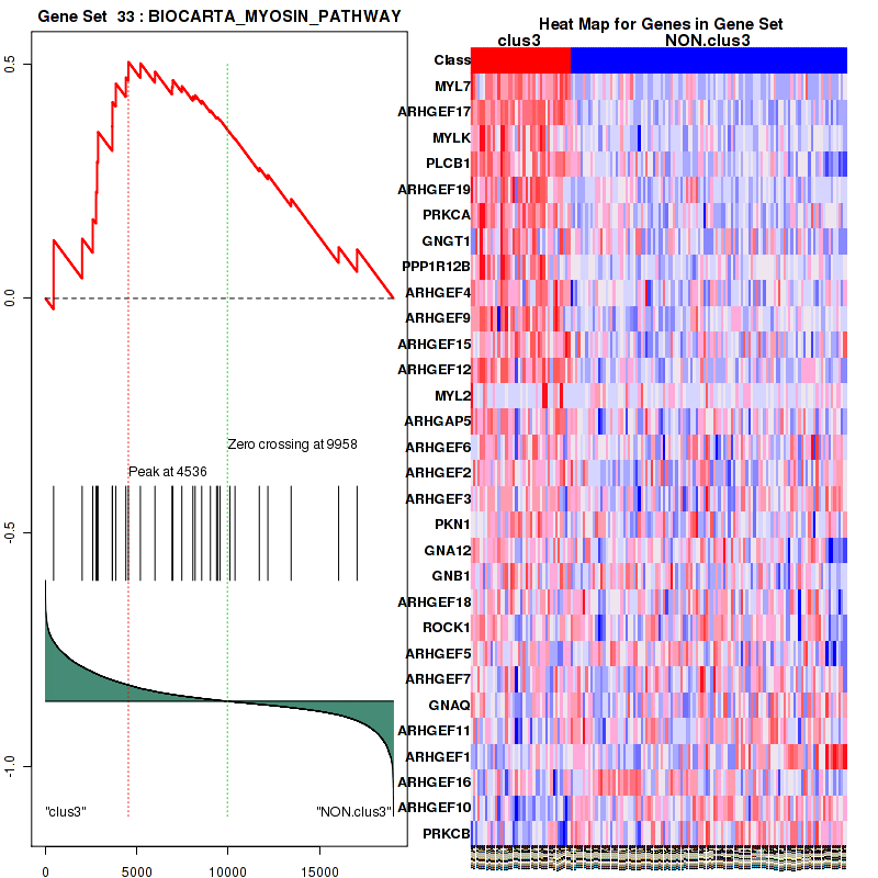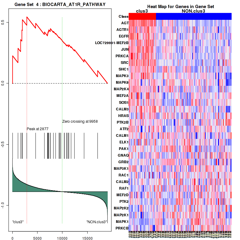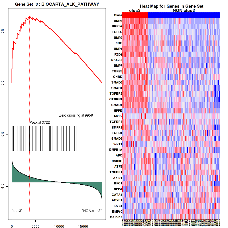 • Top enriched gene sets are BIOCARTA NO1 PATHWAY, BIOCARTA AGR PATHWAY, BIOCARTA ALK PATHWAY, BIOCARTA AT1R PATHWAY, BIOCARTA BIOPEPTIDES PATHWAY, BIOCARTA MYOSIN PATHWAY, BIOCARTA CHREBP2 PATHWAY, KEGG PORPHYRIN AND CHLOROPHYLL METABOLISM, KEGG DRUG METABOLISM OTHER ENZYMES, KEGG WNT SIGNALING PATHWAY