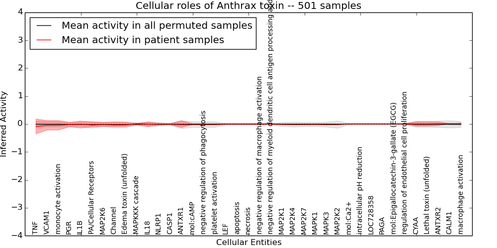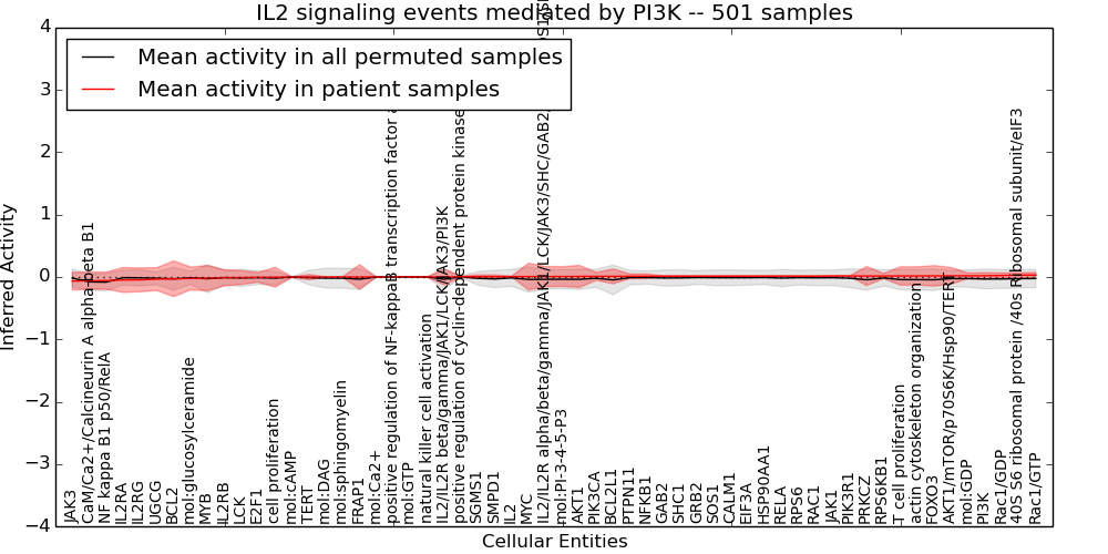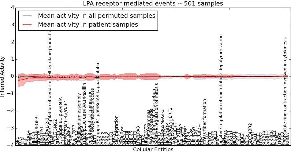 Figure S131. Get High-res Image This plot shows pathway concept perturbations across all samples against a permutation model. The concepts along the x-axis are sorted by lowest to highest mean activity for the real patient samples. Mean inferred activities are plotted along the y-axis as a colored band showing the average level and one standard deviation range. Real samples are shown in red and permuted samples in black.