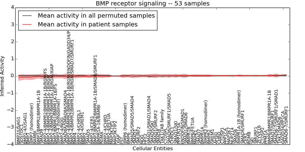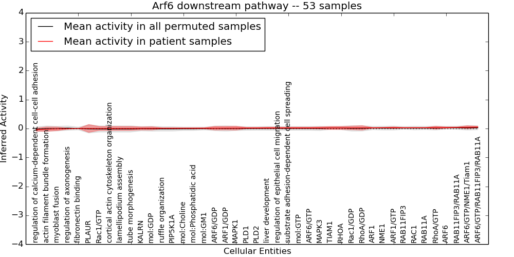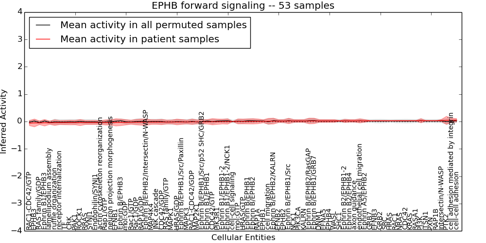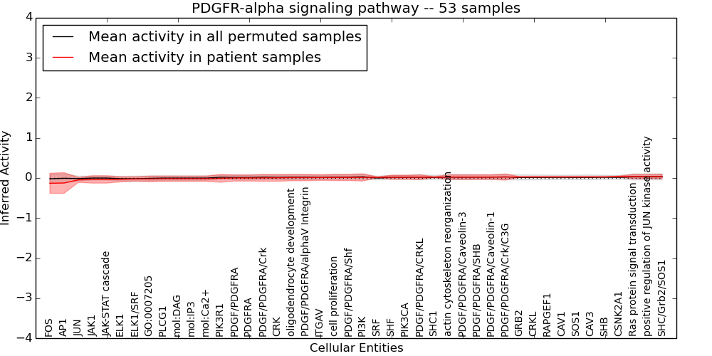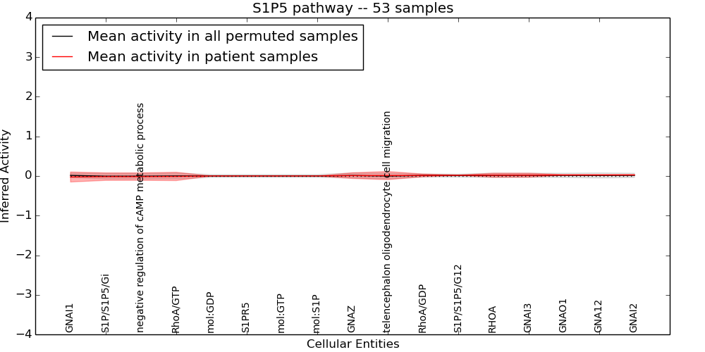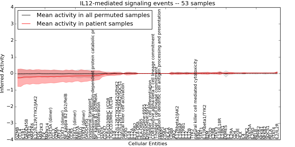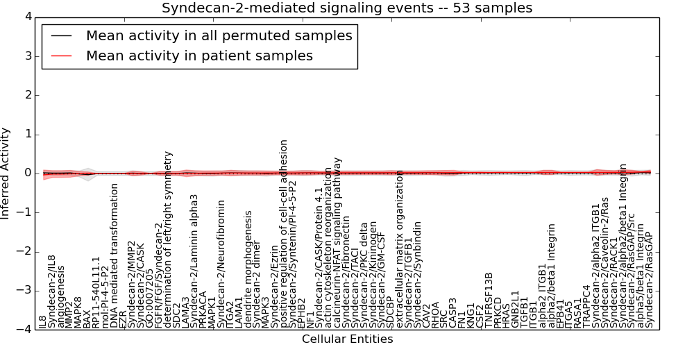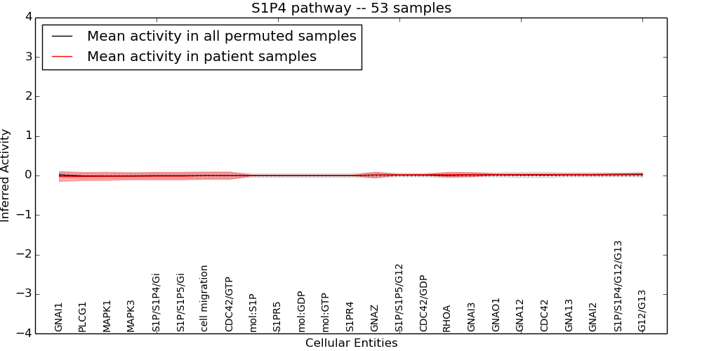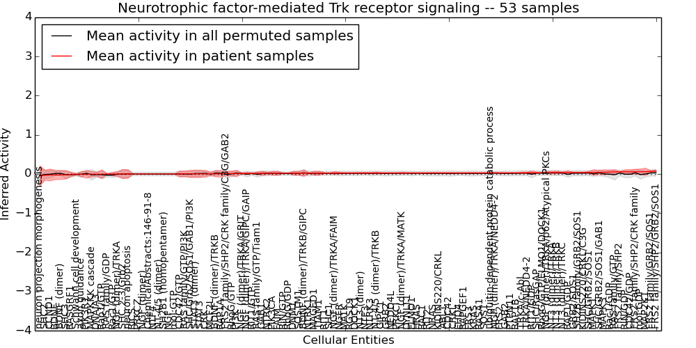 Figure S131. Get High-res Image This plot shows pathway concept perturbations across all samples against a permutation model. The concepts along the x-axis are sorted by lowest to highest mean activity for the real patient samples. Mean inferred activities are plotted along the y-axis as a colored band showing the average level and one standard deviation range. Real samples are shown in red and permuted samples in black.