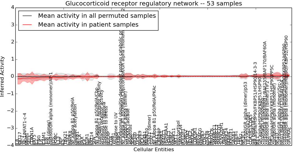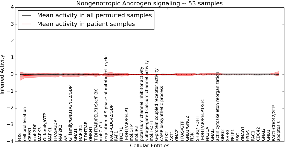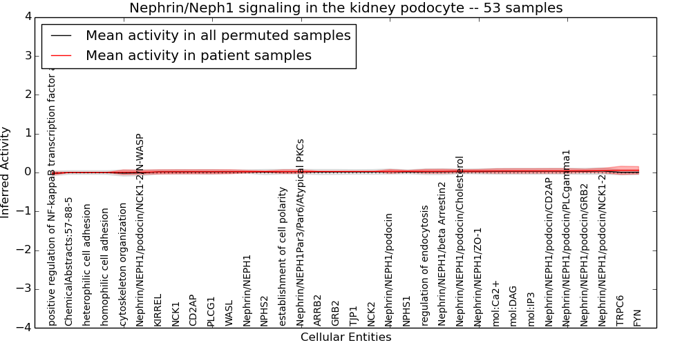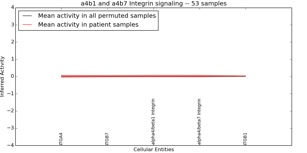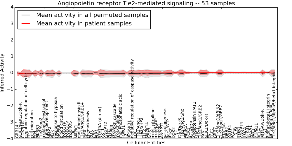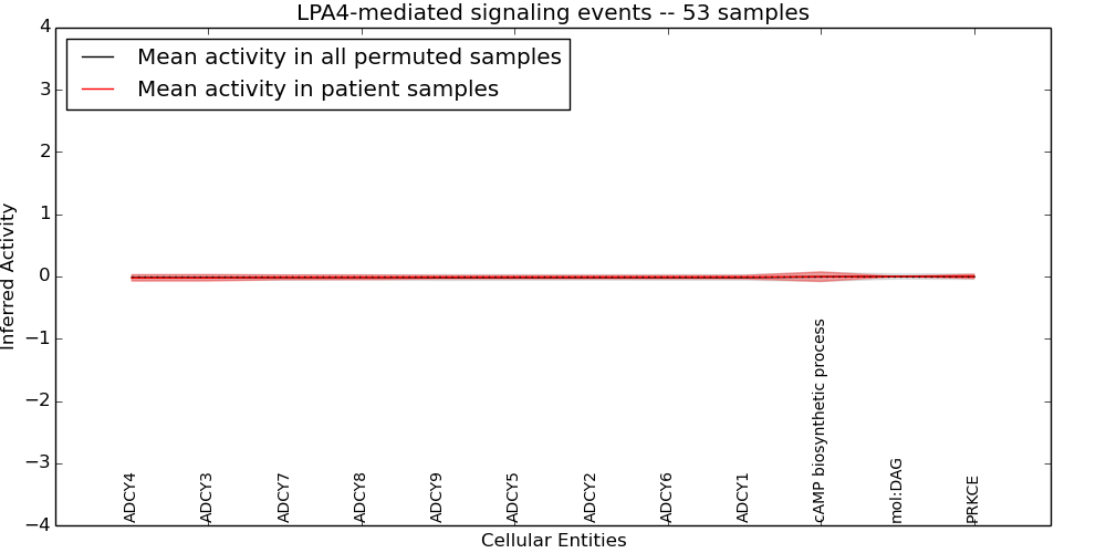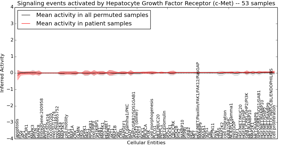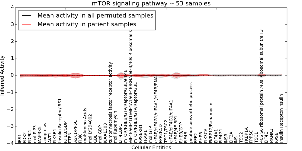Figure S131. Get High-res Image This plot shows pathway concept perturbations across all samples against a permutation model. The concepts along the x-axis are sorted by lowest to highest mean activity for the real patient samples. Mean inferred activities are plotted along the y-axis as a colored band showing the average level and one standard deviation range. Real samples are shown in red and permuted samples in black.