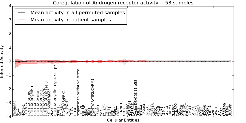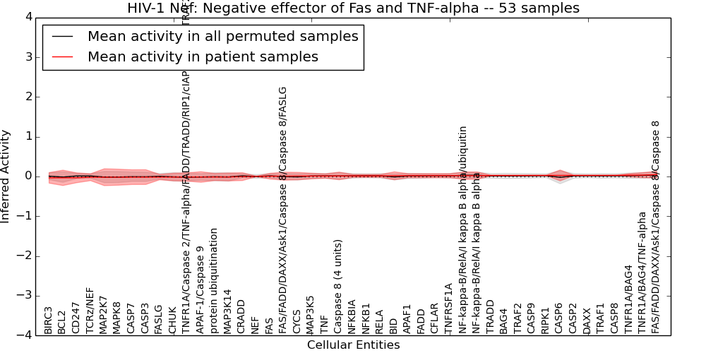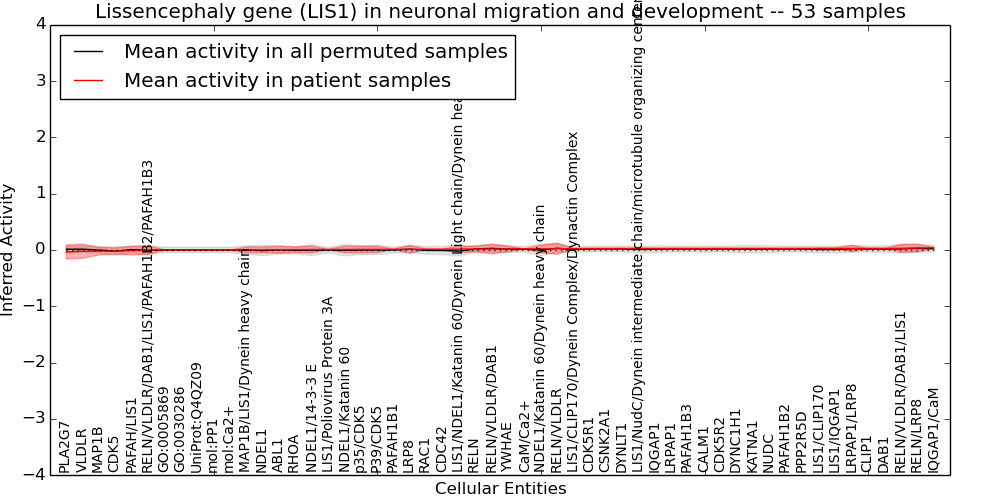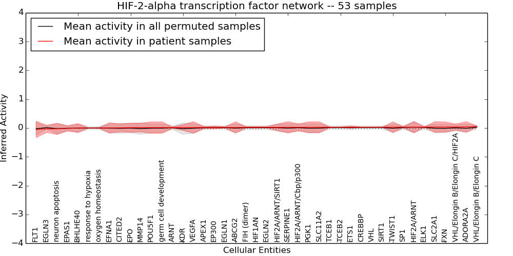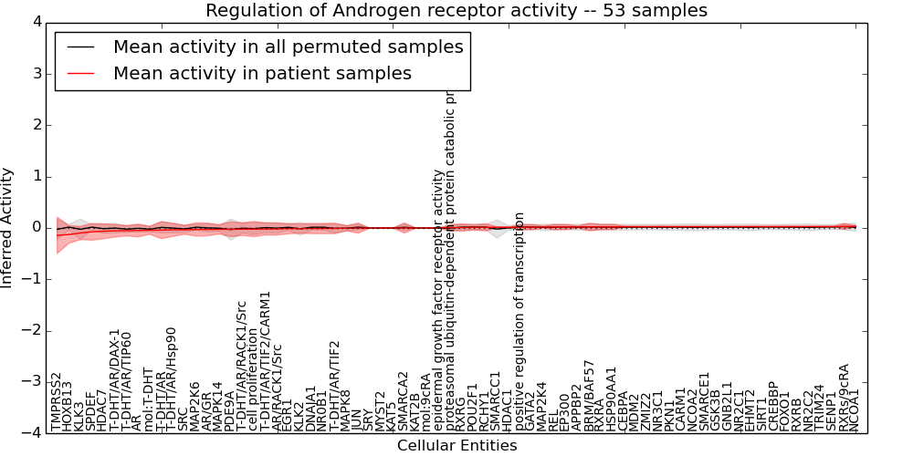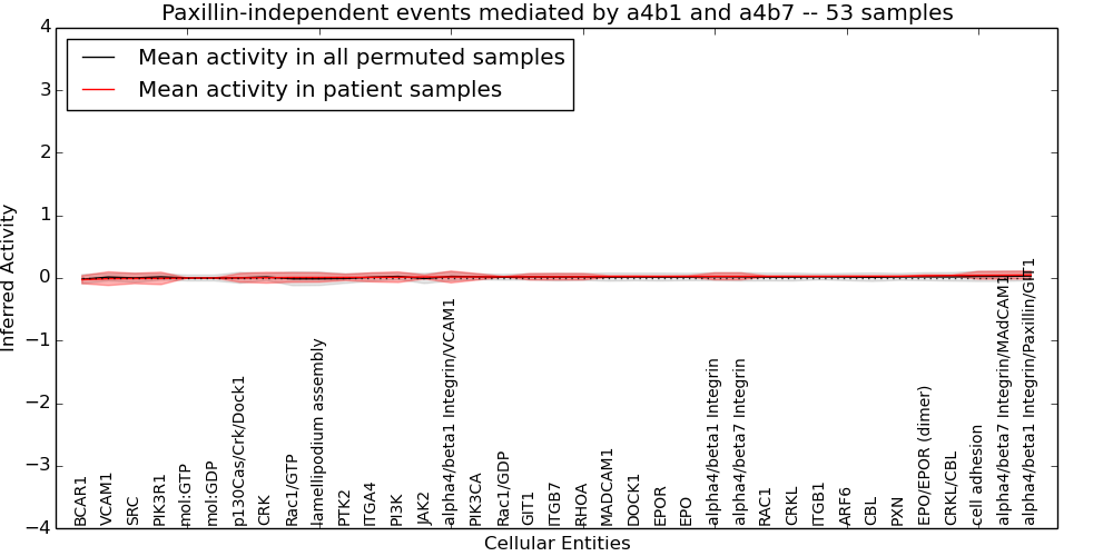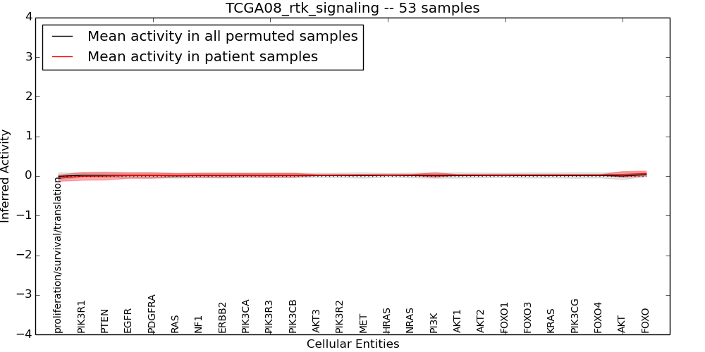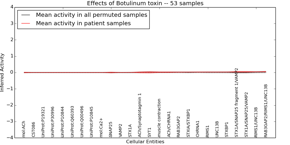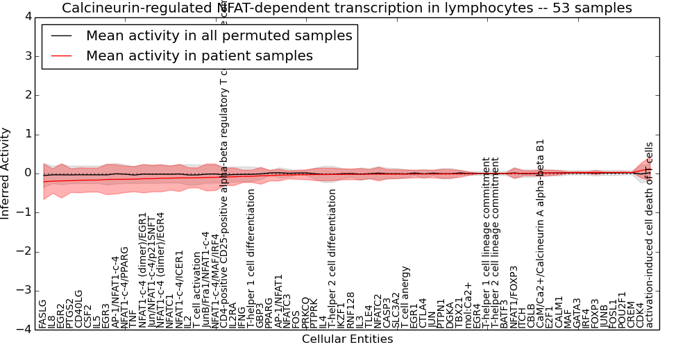 Figure S131. Get High-res Image This plot shows pathway concept perturbations across all samples against a permutation model. The concepts along the x-axis are sorted by lowest to highest mean activity for the real patient samples. Mean inferred activities are plotted along the y-axis as a colored band showing the average level and one standard deviation range. Real samples are shown in red and permuted samples in black.