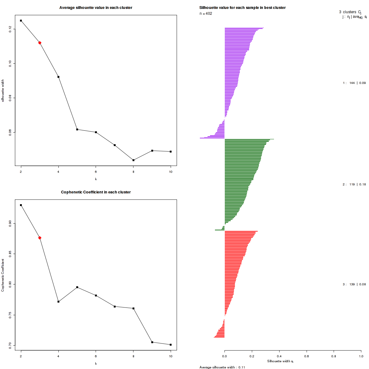 Figure 3. Get High-res Image The silhouette width was calculated for each sample and each value of k. The left upper panel shows the average silhouette width across all samples for each tested k (left upper panel). The left lower panel shows the Cophenetic Correlation Coefficients for each tested k. The right panel shows assignments of clusters to samples and the k silhouette width of each sample for the most robust clustering.