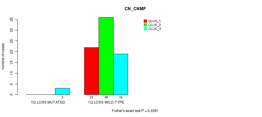 1q loss cnv correlated to 'CN_CNMF', 'MIRSEQ_CHIERARCHICAL', and 'MIRSEQ_MATURE_CHIERARCHICAL'.