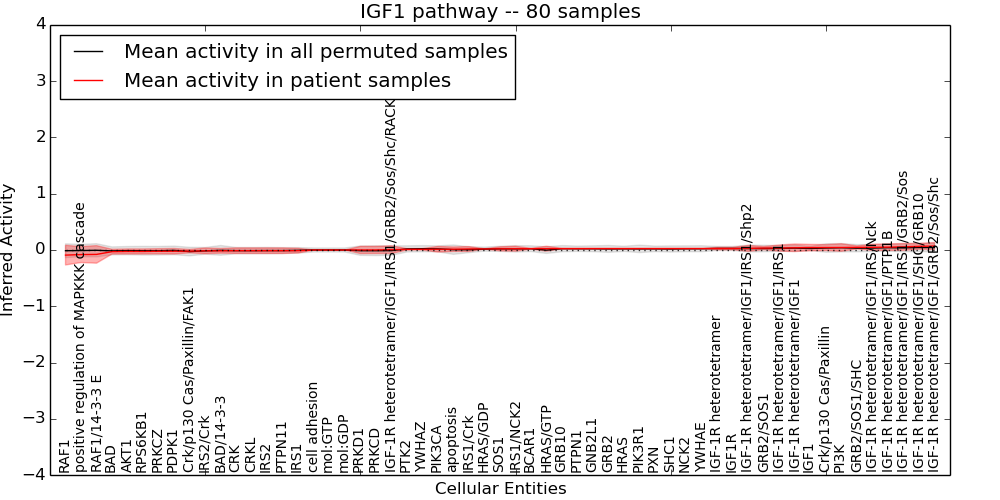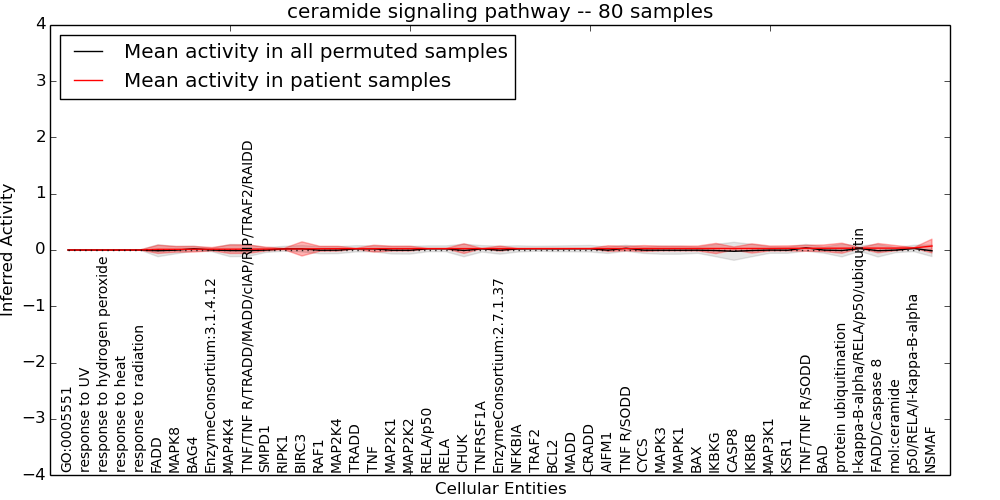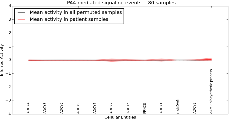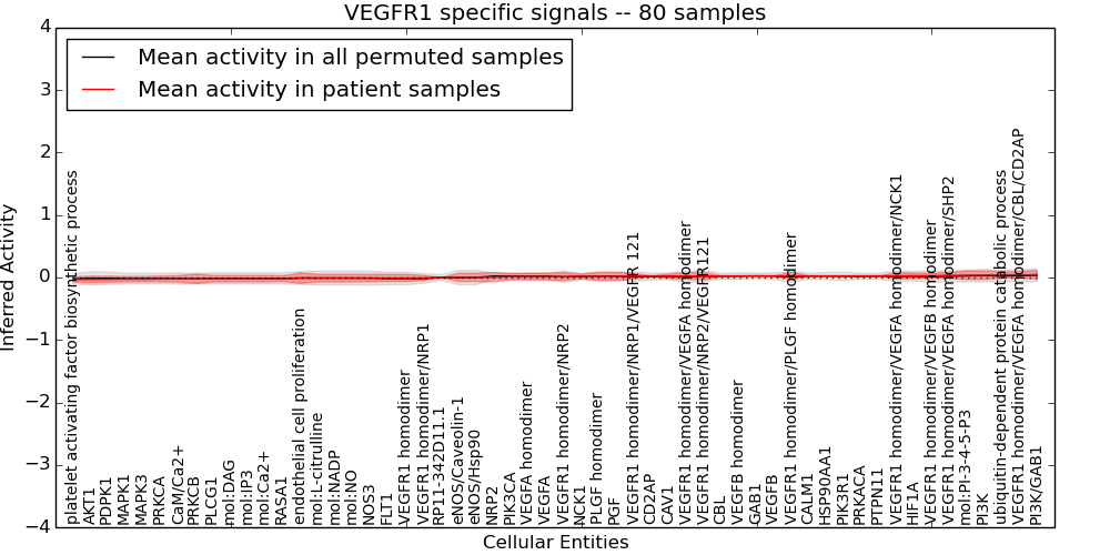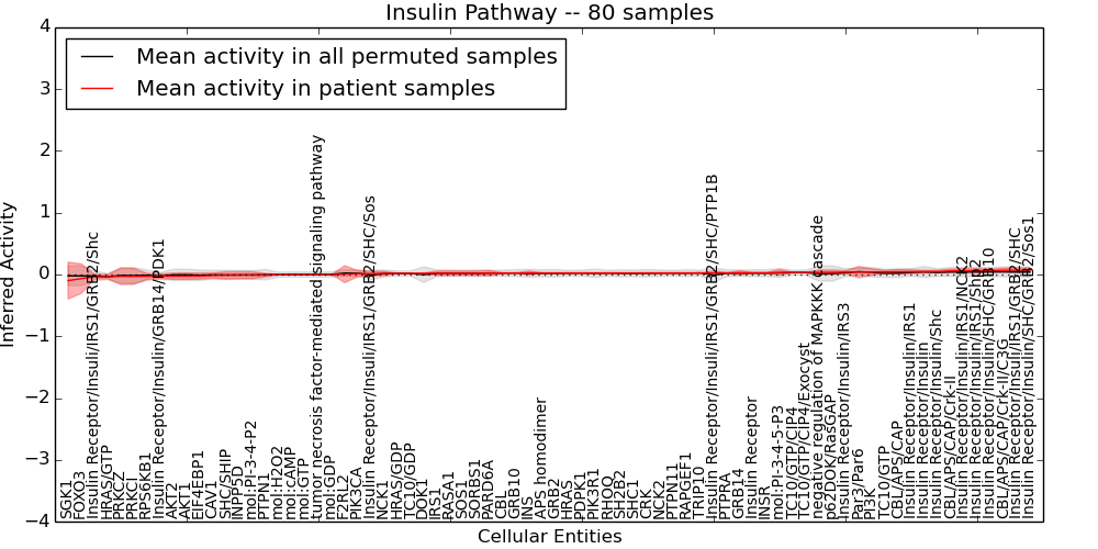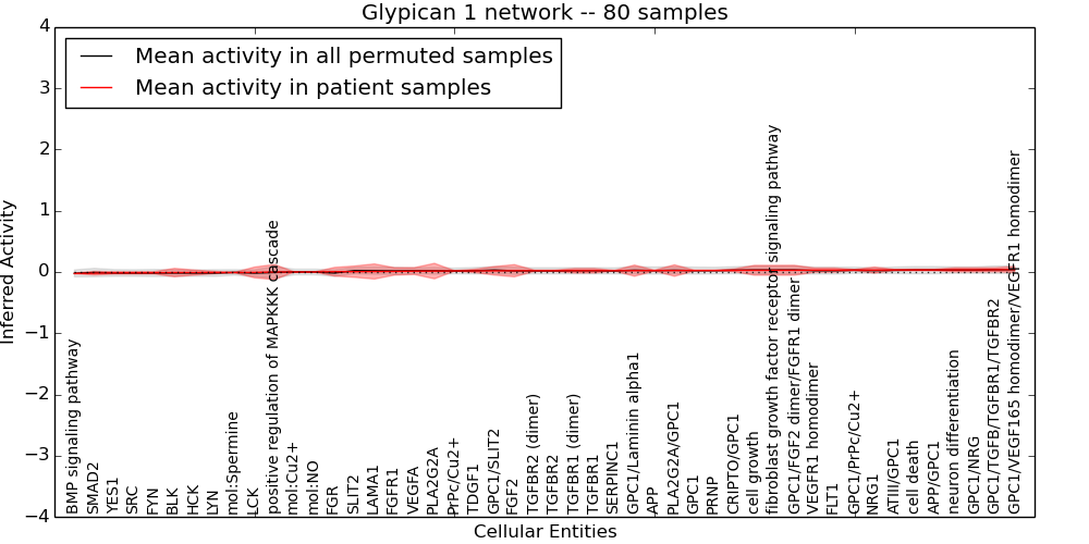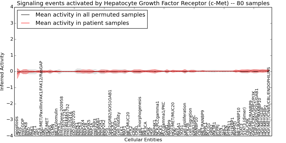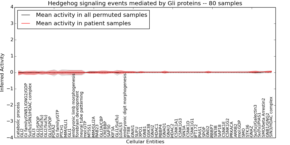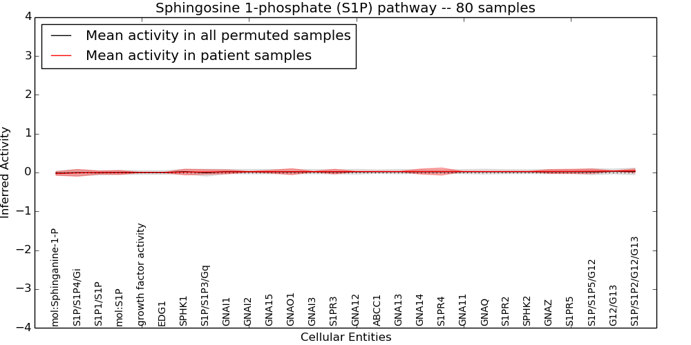 Figure S131. Get High-res Image This plot shows pathway concept perturbations across all samples against a permutation model. The concepts along the x-axis are sorted by lowest to highest mean activity for the real patient samples. Mean inferred activities are plotted along the y-axis as a colored band showing the average level and one standard deviation range. Real samples are shown in red and permuted samples in black.