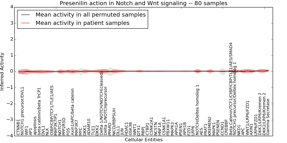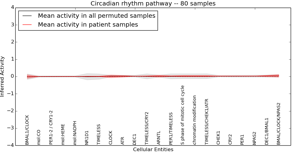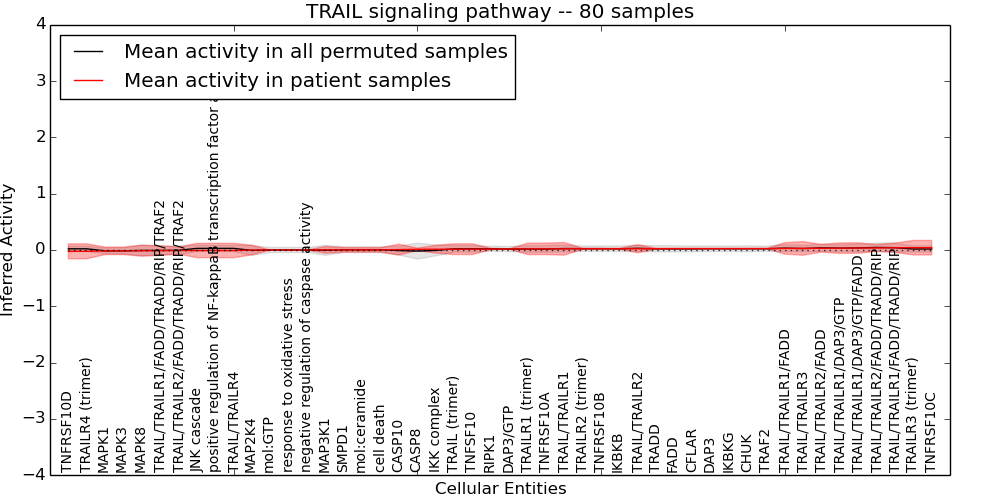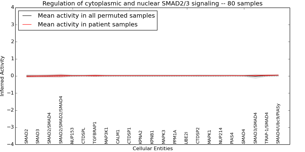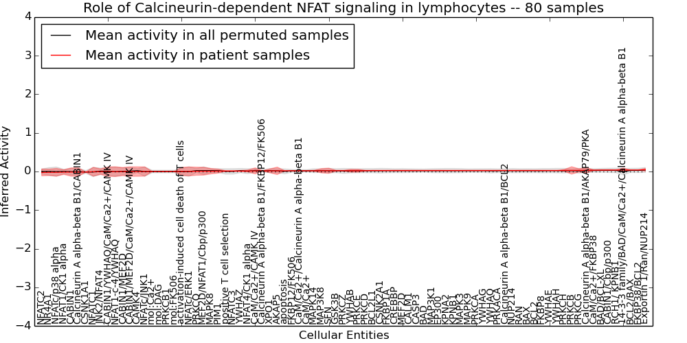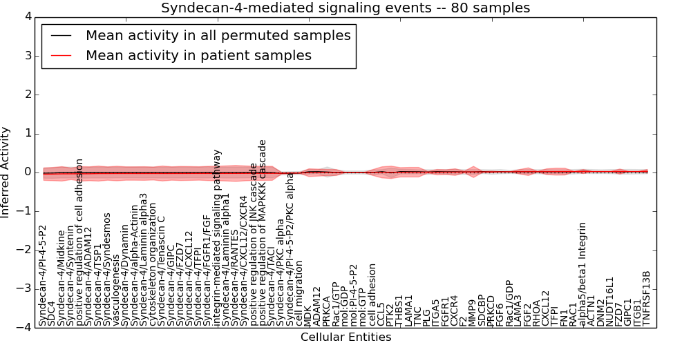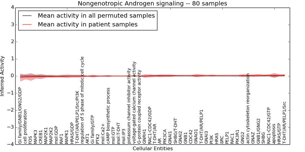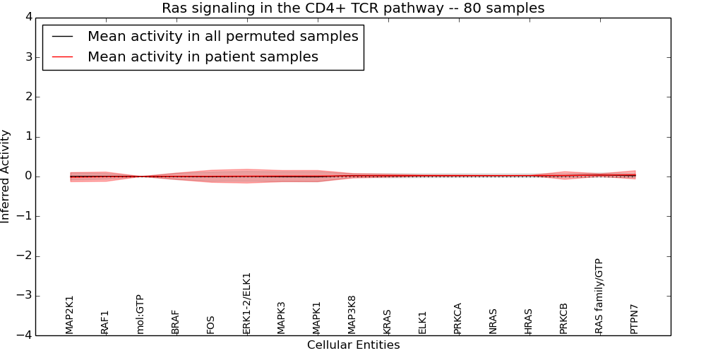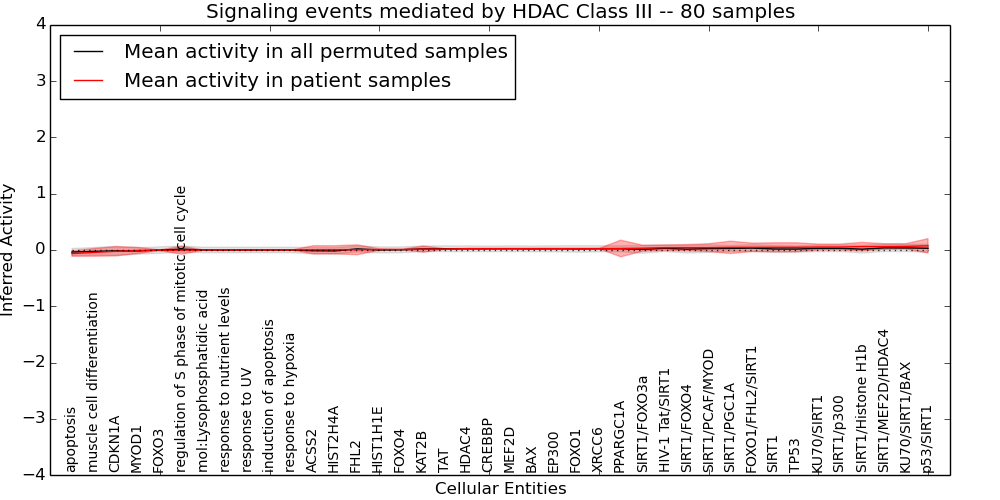 Figure S131. Get High-res Image This plot shows pathway concept perturbations across all samples against a permutation model. The concepts along the x-axis are sorted by lowest to highest mean activity for the real patient samples. Mean inferred activities are plotted along the y-axis as a colored band showing the average level and one standard deviation range. Real samples are shown in red and permuted samples in black.