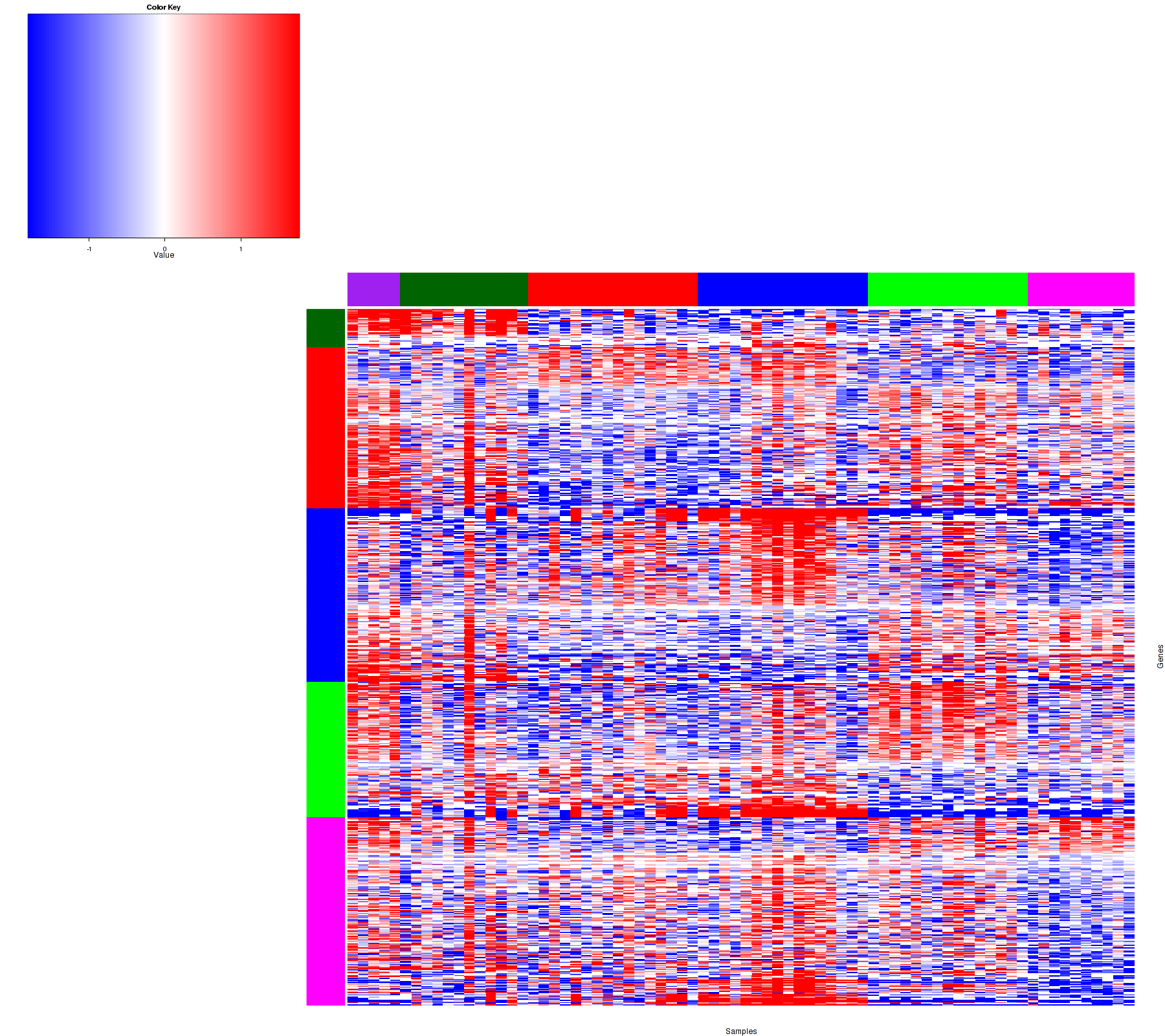 Figure 1. Get High-res Image Samples were separated into 6 clusters. Shown are 74 samples and 706 marker miRs. The color bar of the row indicates the marker miRs for the corresponding cluster.