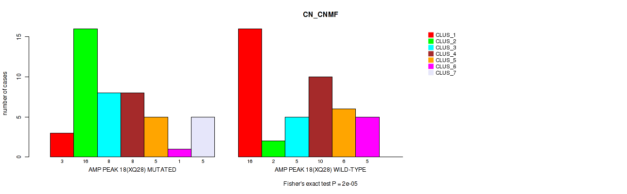 amp_xq28 cnv correlated to 'CN_CNMF', 'METHLYATION_CNMF', 'RPPA_CHIERARCHICAL', 'MRNASEQ_CNMF', and 'MRNASEQ_CHIERARCHICAL'.