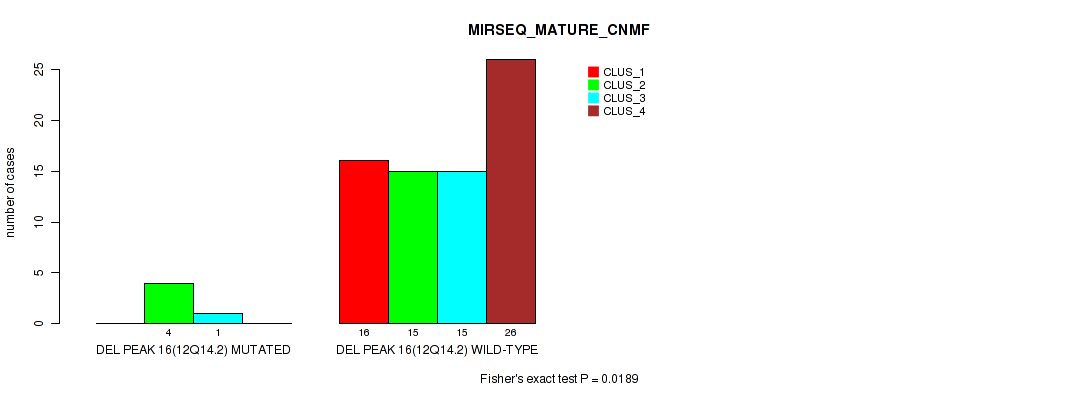 del_12q14.2 cnv correlated to 'MRNASEQ_CHIERARCHICAL', 'MIRSEQ_MATURE_CNMF', and 'MIRSEQ_MATURE_CHIERARCHICAL'.