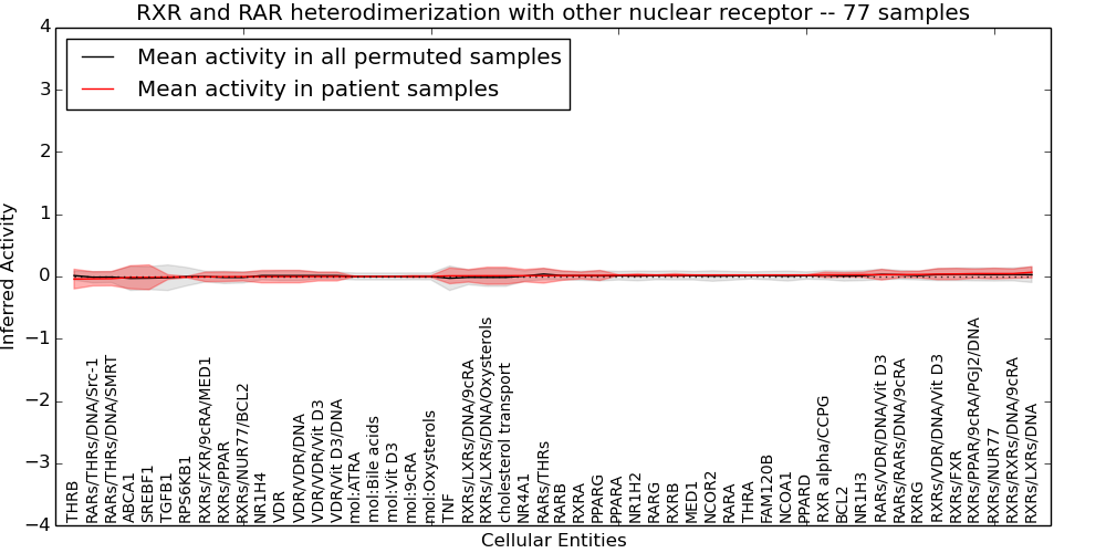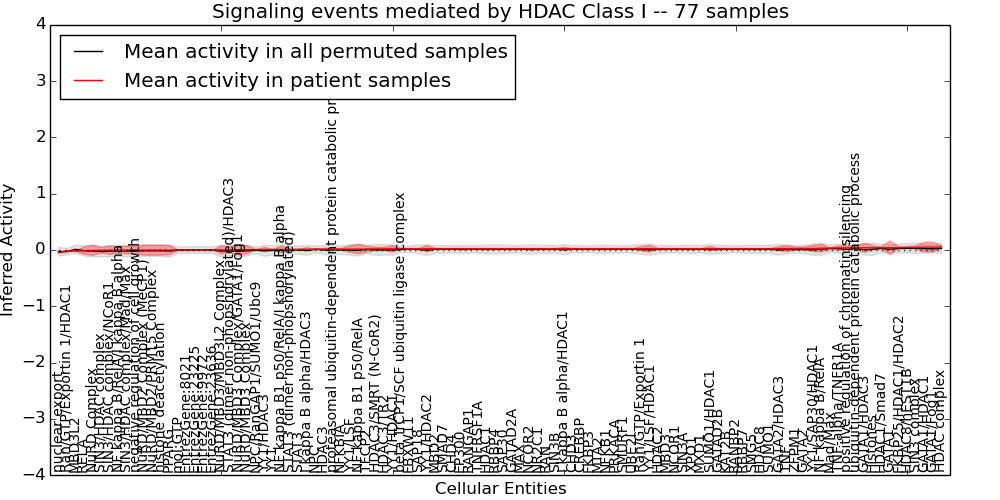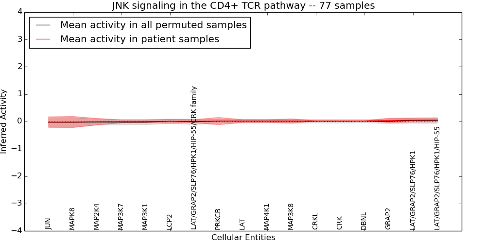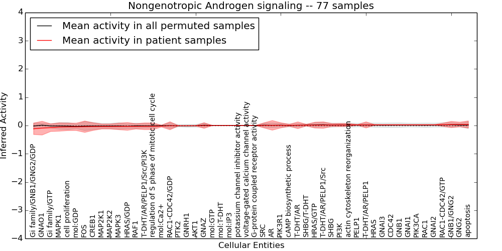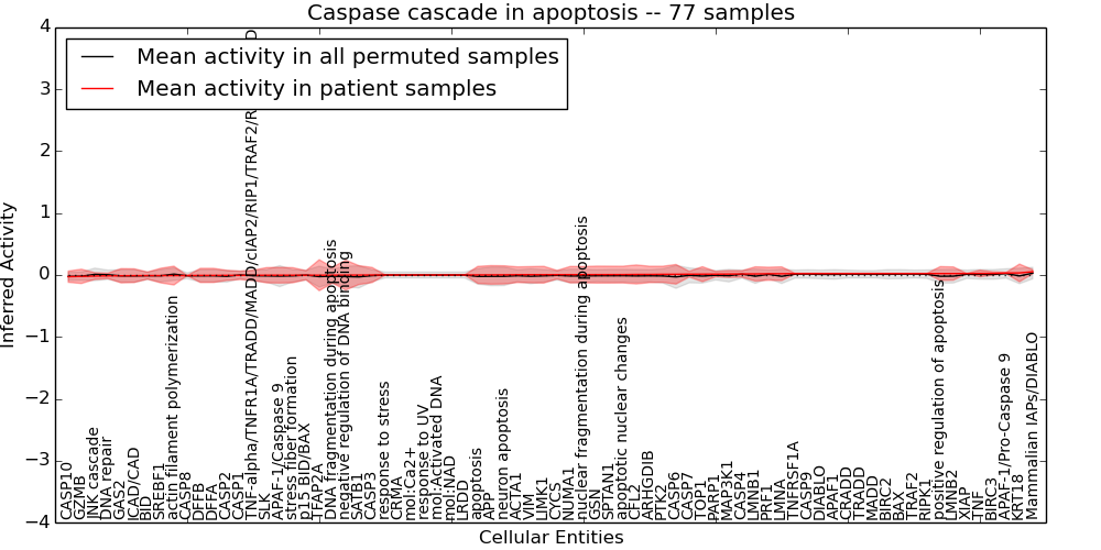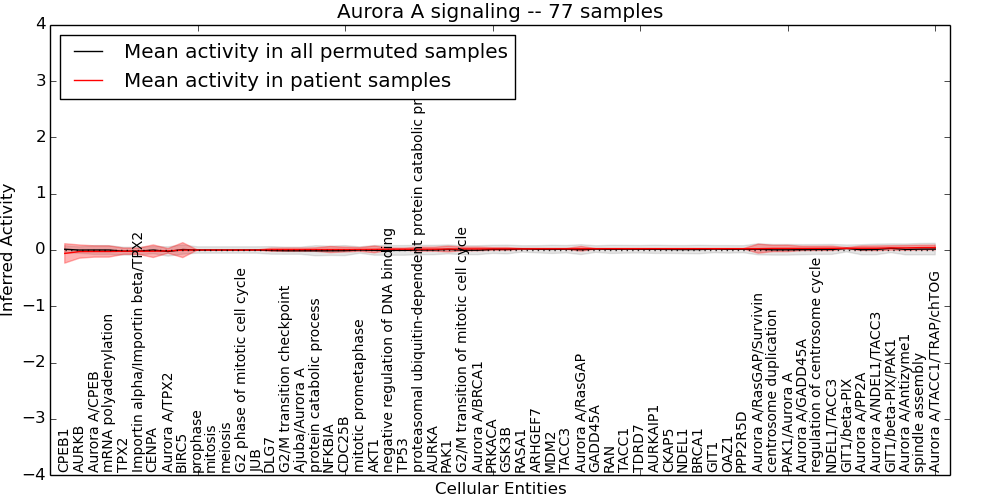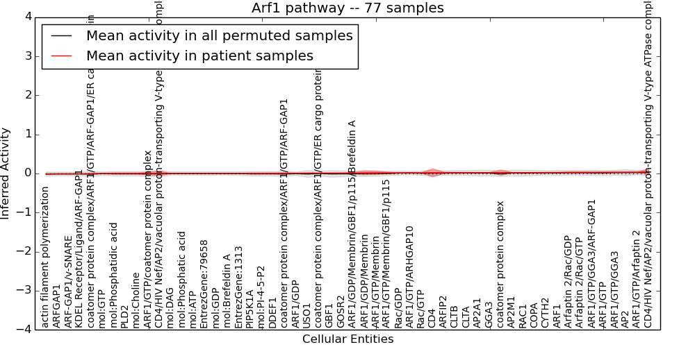 Figure S131. Get High-res Image This plot shows pathway concept perturbations across all samples against a permutation model. The concepts along the x-axis are sorted by lowest to highest mean activity for the real patient samples. Mean inferred activities are plotted along the y-axis as a colored band showing the average level and one standard deviation range. Real samples are shown in red and permuted samples in black.