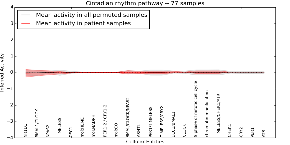 Figure S130. Get High-res Image This plot shows pathway concept perturbations across all samples against a permutation model. The concepts along the x-axis are sorted by lowest to highest mean activity for the real patient samples. Mean inferred activities are plotted along the y-axis as a colored band showing the average level and one standard deviation range. Real samples are shown in red and permuted samples in black.