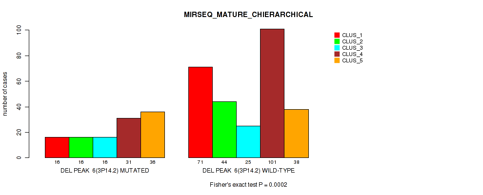 del_3p14.2 cnv correlated to 'CN_CNMF', 'METHLYATION_CNMF', 'RPPA_CNMF', 'RPPA_CHIERARCHICAL', 'MRNASEQ_CNMF', 'MRNASEQ_CHIERARCHICAL', 'MIRSEQ_CNMF', 'MIRSEQ_MATURE_CNMF', and 'MIRSEQ_MATURE_CHIERARCHICAL'.