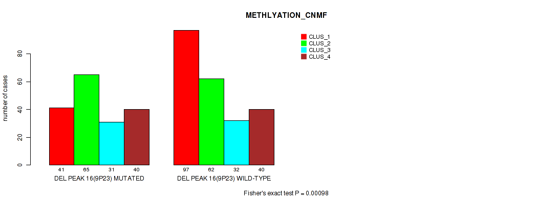 del_16p13.3 cnv correlated to 'CN_CNMF', 'METHLYATION_CNMF', 'RPPA_CNMF', and 'MRNASEQ_CNMF'.