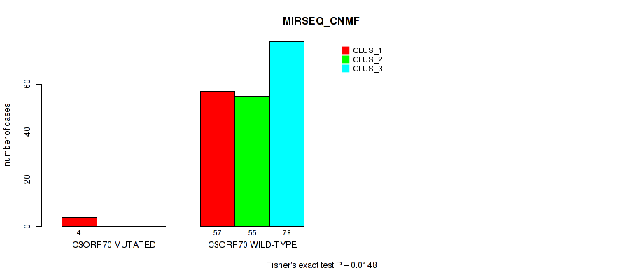 • C3ORF70 mutation correlated to 'MIRSEQ_CNMF',  'MIRSEQ_MATURE_CNMF', and 'MIRSEQ_MATURE_CHIERARCHICAL'.