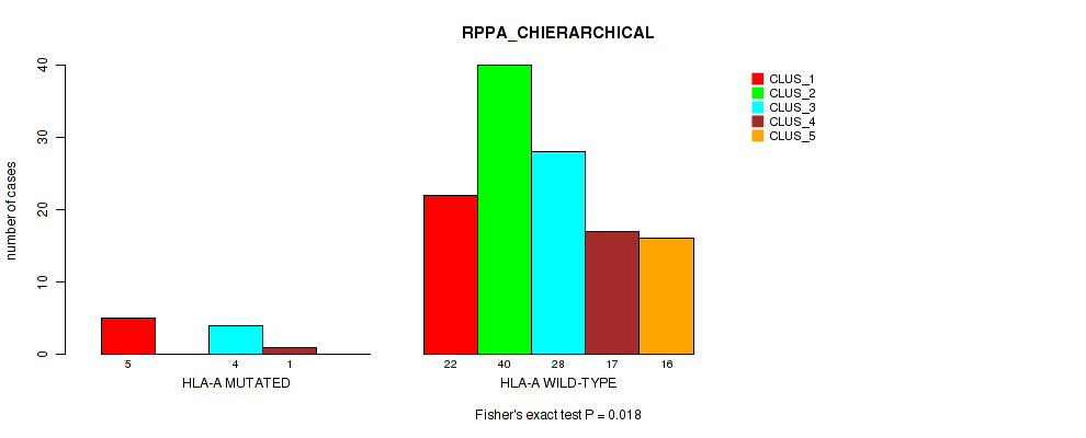 • HLA-A mutation correlated to 'METHLYATION_CNMF',  'RPPA_CHIERARCHICAL',  'MRNASEQ_CNMF', and 'MIRSEQ_CHIERARCHICAL'.