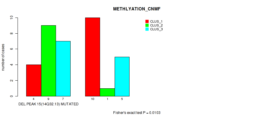 Table S15. Gene #18: 'del_14q32.13' versus Molecular Subtype #2: 'METHLYATION_CNMF'