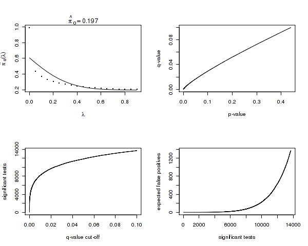 Figure 2. Plot 1. The estimated pi_0 versus the tuning parameter lambda. Plot 2. The q-values versus the p-values. Plot 3. The number of significant tests versus each q-value cutoff. Plot 4. The number of expected false positives versus the number of significant tests.The first is a plot of the estimate of pi_0 versus its tuning parameter lambda. In most cases, as lambda gets larger, the bias of the estimate decreases, yet the variance increases. Comparing your estimate of pi_0 to this plot allows one to guage its quality. The remaining three plots show how many tests are significant, as well as how many false positives to expect for each q-value cut-off.
