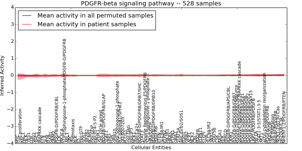 Figure S131. Get High-res Image This plot shows pathway concept perturbations across all samples against a permutation model. The concepts along the x-axis are sorted by lowest to highest mean activity for the real patient samples. Mean inferred activities are plotted along the y-axis as a colored band showing the average level and one standard deviation range. Real samples are shown in red and permuted samples in black.