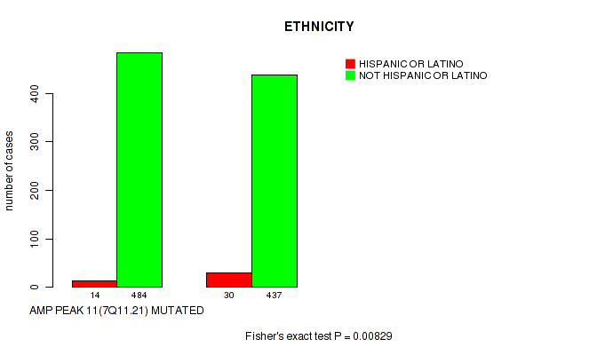 amp_7q11.21 cnv correlated to 'Time to Death', 'YEARS_TO_BIRTH', 'TUMOR_TISSUE_SITE', 'RADIATION_THERAPY', 'KARNOFSKY_PERFORMANCE_SCORE', 'HISTOLOGICAL_TYPE', 'RACE', and 'ETHNICITY'.