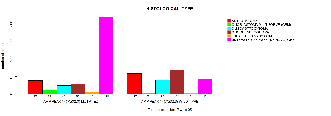 amp_14q32.33 cnv correlated to 'Time to Death', 'YEARS_TO_BIRTH', 'TUMOR_TISSUE_SITE', 'RADIATION_THERAPY', 'KARNOFSKY_PERFORMANCE_SCORE', and 'HISTOLOGICAL_TYPE'.