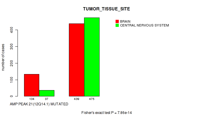 amp_12q14.1 cnv correlated to 'Time to Death', 'YEARS_TO_BIRTH', 'TUMOR_TISSUE_SITE', 'RADIATION_THERAPY', 'KARNOFSKY_PERFORMANCE_SCORE', 'HISTOLOGICAL_TYPE', and 'ETHNICITY'.