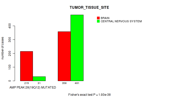 Figure S386. Get High-res Image Gene #73: 'del_19q13.43' versus Clinical Feature #3: 'TUMOR_TISSUE_SITE'