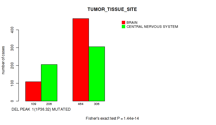 del_1p36.32 cnv correlated to 'Time to Death', 'TUMOR_TISSUE_SITE', 'RADIATION_THERAPY', 'KARNOFSKY_PERFORMANCE_SCORE', 'HISTOLOGICAL_TYPE', and 'RACE'.