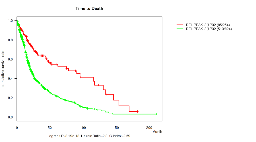 del_3q13.31 cnv correlated to 'Time to Death' and 'RADIATION_THERAPY'.