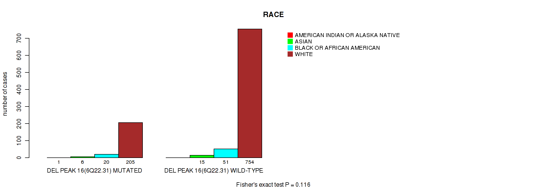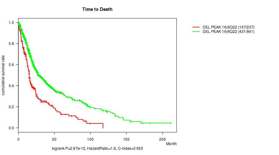 del_6q22.31 cnv correlated to 'Time to Death', 'YEARS_TO_BIRTH', 'TUMOR_TISSUE_SITE', 'GENDER', 'RADIATION_THERAPY', 'KARNOFSKY_PERFORMANCE_SCORE', 'HISTOLOGICAL_TYPE', 'RACE', and 'ETHNICITY'.