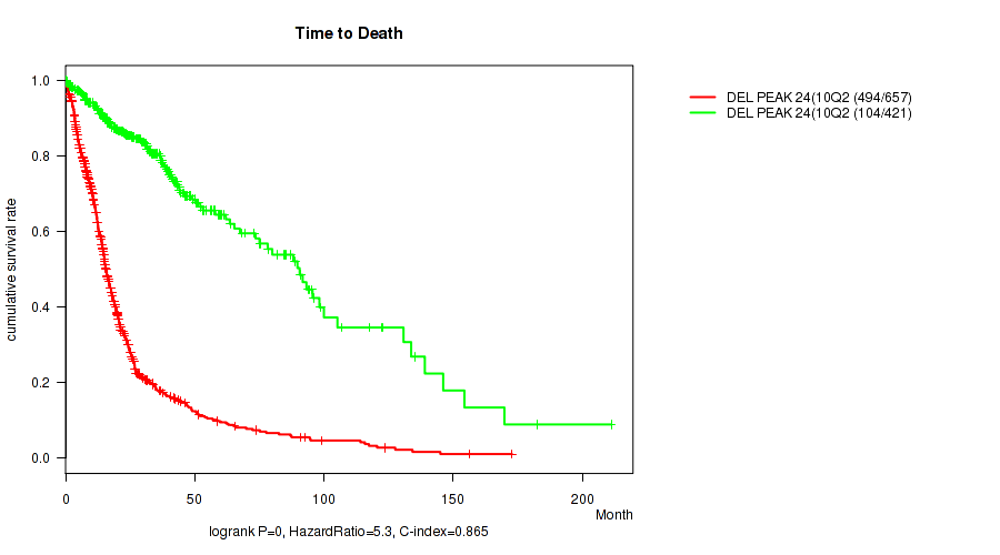 del_10q23.31 cnv correlated to 'Time to Death', 'YEARS_TO_BIRTH', 'TUMOR_TISSUE_SITE', 'RADIATION_THERAPY', 'KARNOFSKY_PERFORMANCE_SCORE', 'HISTOLOGICAL_TYPE', 'RACE', and 'ETHNICITY'.