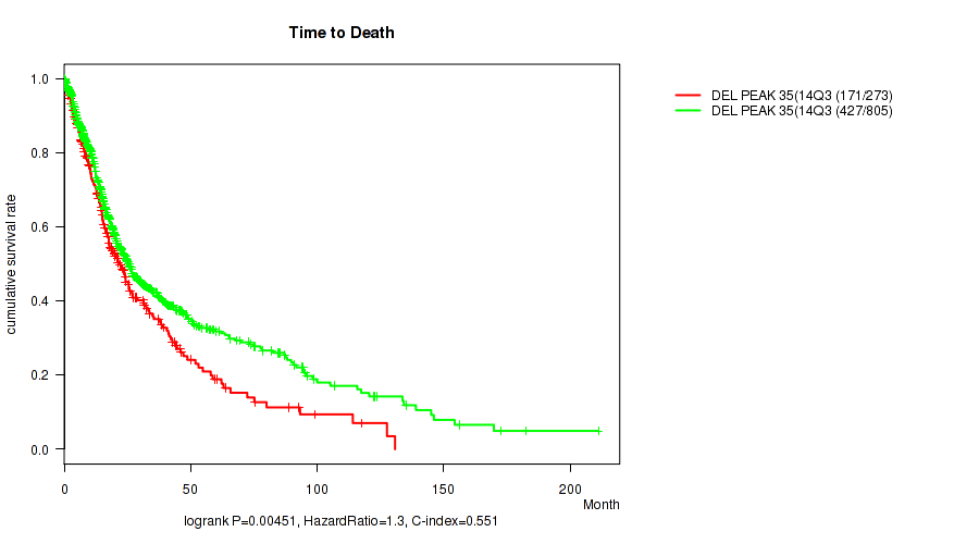 del_14q31.3 cnv correlated to 'Time to Death', 'YEARS_TO_BIRTH', 'TUMOR_TISSUE_SITE', 'GENDER', 'HISTOLOGICAL_TYPE', and 'RACE'.