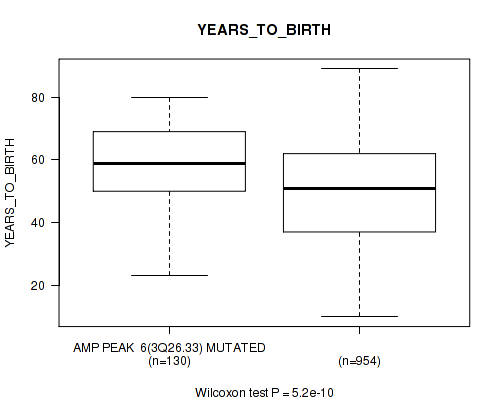 amp_3q26.33 cnv correlated to 'Time to Death', 'YEARS_TO_BIRTH', 'TUMOR_TISSUE_SITE', 'KARNOFSKY_PERFORMANCE_SCORE', 'HISTOLOGICAL_TYPE', and 'ETHNICITY'.