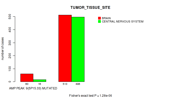 amp_5p15.33 cnv correlated to 'Time to Death', 'YEARS_TO_BIRTH', 'TUMOR_TISSUE_SITE', 'RADIATION_THERAPY', and 'HISTOLOGICAL_TYPE'.