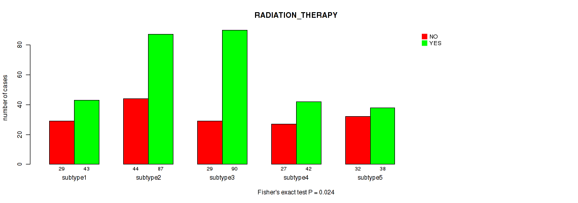 Table S140. Clustering Approach #10: 'MIRseq Mature cHierClus subtypes' versus Clinical Feature #8: 'RADIATION_THERAPY'