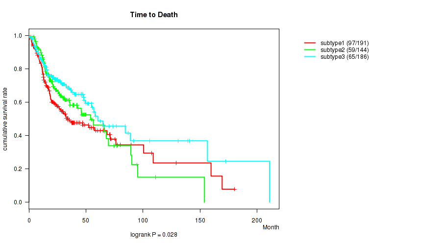 Table S133. Clustering Approach #10: 'MIRseq Mature cHierClus subtypes' versus Clinical Feature #1: 'Time to Death'