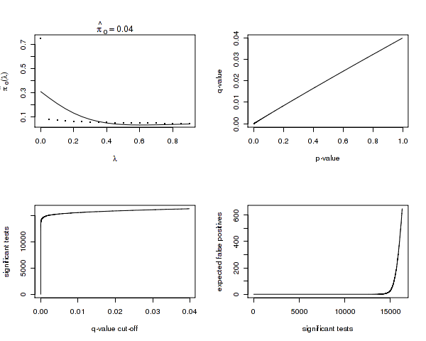 Figure 2. Plot 1. The estimated pi_0 versus the tuning parameter lambda. Plot 2. The q-values versus the p-values. Plot 3. The number of significant tests versus each q-value cutoff. Plot 4. The number of expected false positives versus the number of significant tests.The first is a plot of the estimate of pi_0 versus its tuning parameter lambda. In most cases, as lambda gets larger, the bias of the estimate decreases, yet the variance increases. Comparing your estimate of pi_0 to this plot allows one to guage its quality. The remaining three plots show how many tests are significant, as well as how many false positives to expect for each q-value cut-off.