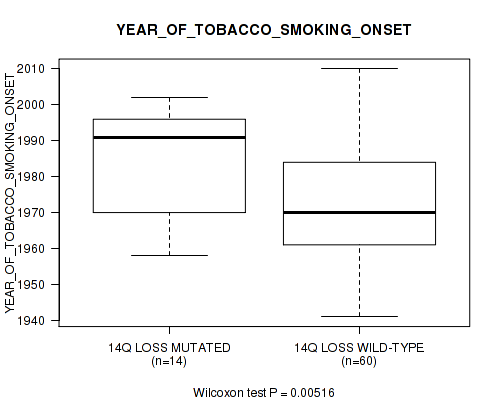 14q gain cnv correlated to 'YEARS_TO_BIRTH', 'PATHOLOGIC_STAGE', 'PATHOLOGY_T_STAGE', 'HISTOLOGICAL_TYPE', and 'YEAR_OF_TOBACCO_SMOKING_ONSET'.