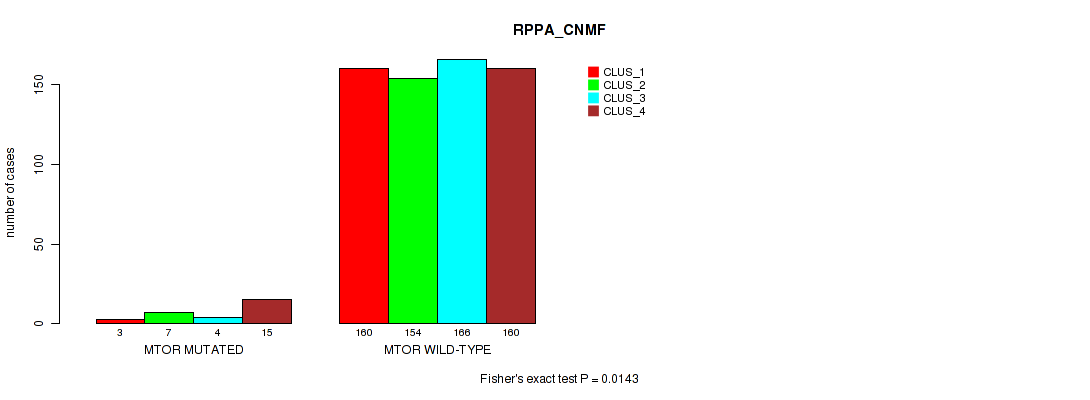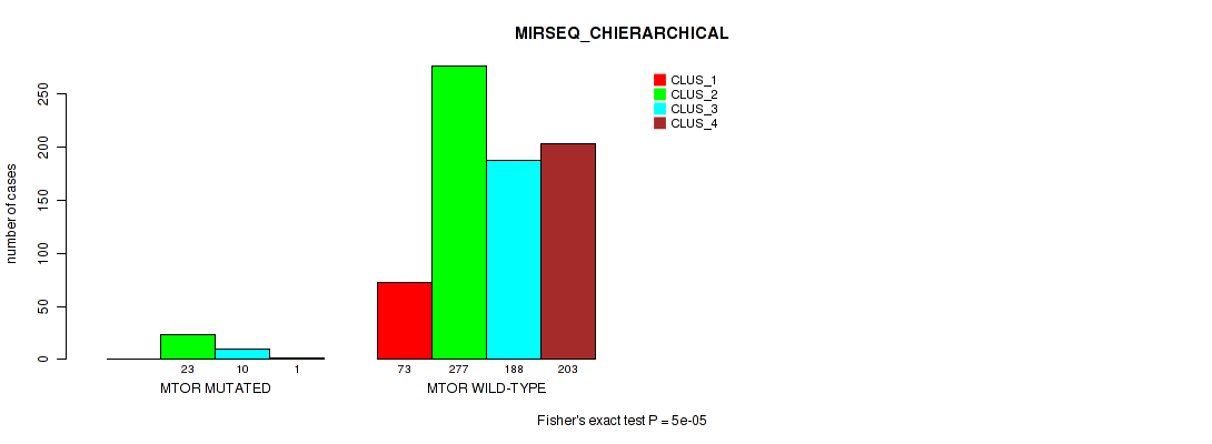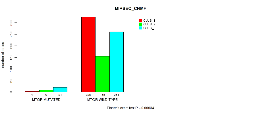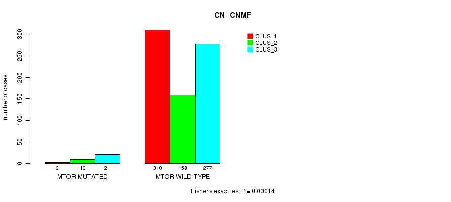MTOR mutation correlated to 'CN_CNMF', 'METHLYATION_CNMF', 'RPPA_CNMF', 'RPPA_CHIERARCHICAL', 'MRNASEQ_CNMF', 'MRNASEQ_CHIERARCHICAL', 'MIRSEQ_CNMF', 'MIRSEQ_CHIERARCHICAL', and 'MIRSEQ_MATURE_CHIERARCHICAL'.