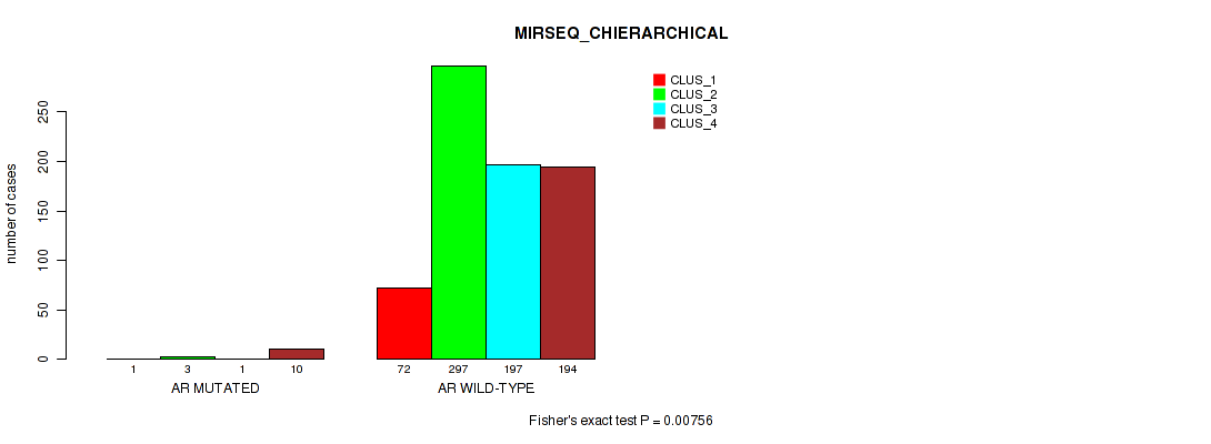 AR mutation correlated to 'CN_CNMF', 'MRNASEQ_CNMF', 'MRNASEQ_CHIERARCHICAL', 'MIRSEQ_CNMF', and 'MIRSEQ_CHIERARCHICAL'.