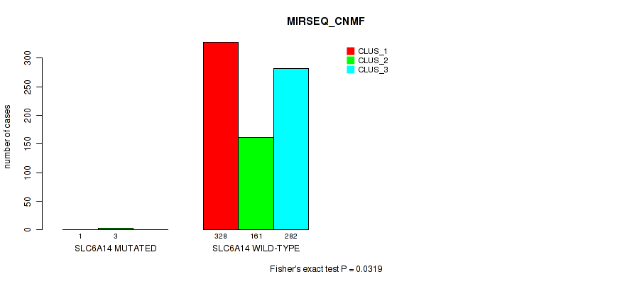SLC6A14 mutation correlated to 'MIRSEQ_CNMF' and 'MIRSEQ_MATURE_CNMF'.