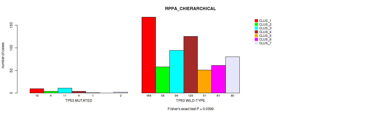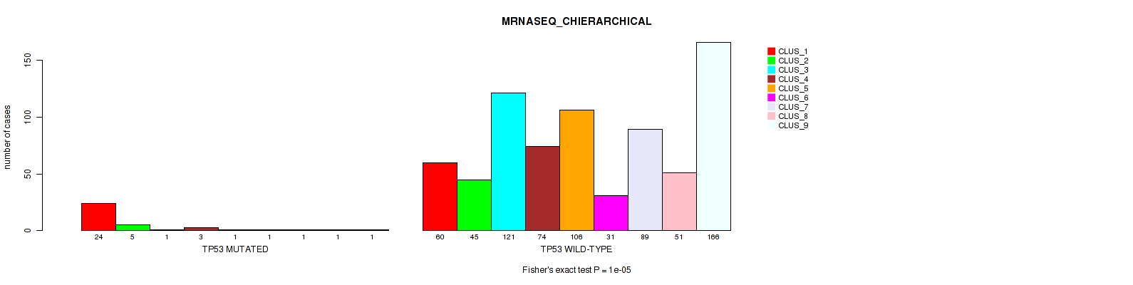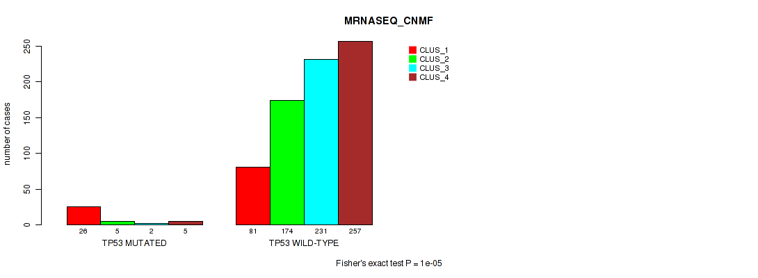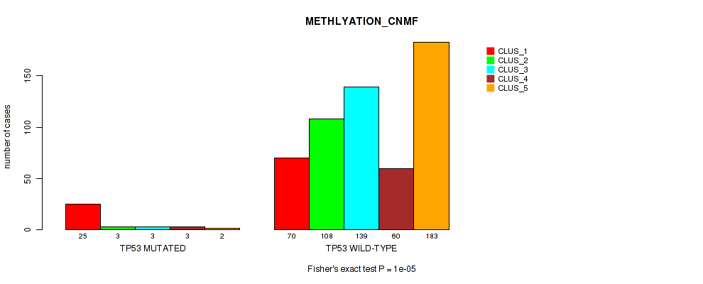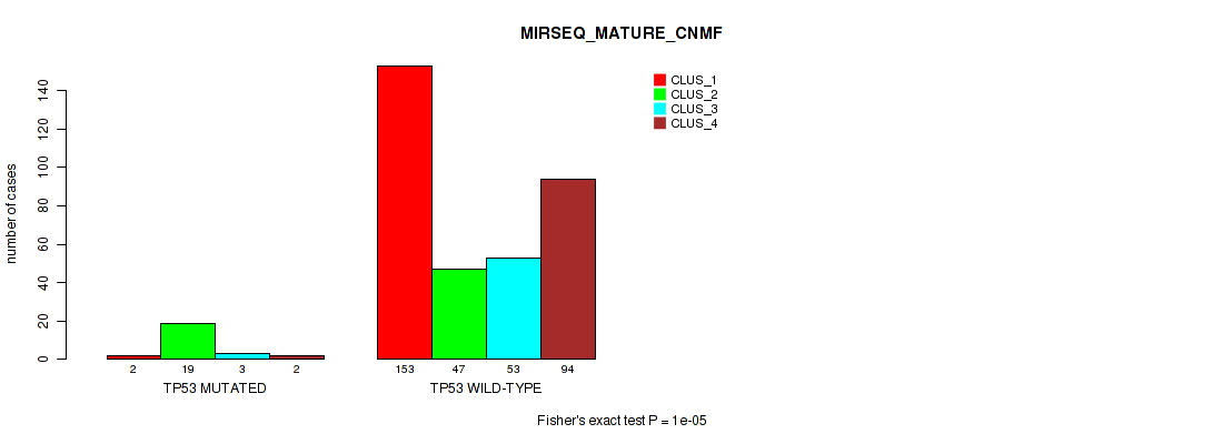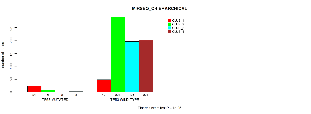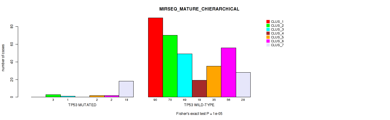 TP53 mutation correlated to 'CN_CNMF', 'METHLYATION_CNMF', 'MRNASEQ_CNMF', 'MRNASEQ_CHIERARCHICAL', 'MIRSEQ_CNMF', 'MIRSEQ_CHIERARCHICAL', 'MIRSEQ_MATURE_CNMF', and 'MIRSEQ_MATURE_CHIERARCHICAL'.