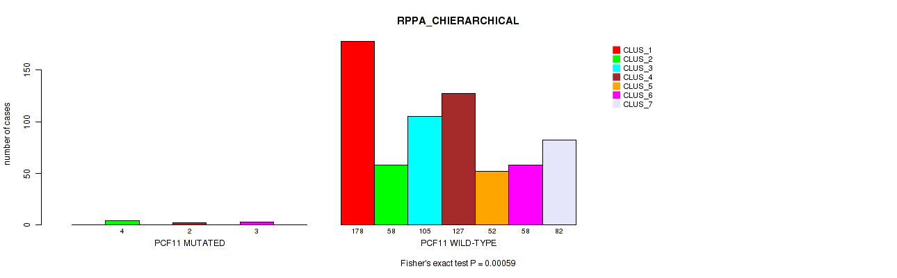 PCF11 mutation correlated to 'CN_CNMF', 'RPPA_CHIERARCHICAL', 'MRNASEQ_CNMF', 'MIRSEQ_CNMF', and 'MIRSEQ_MATURE_CNMF'.