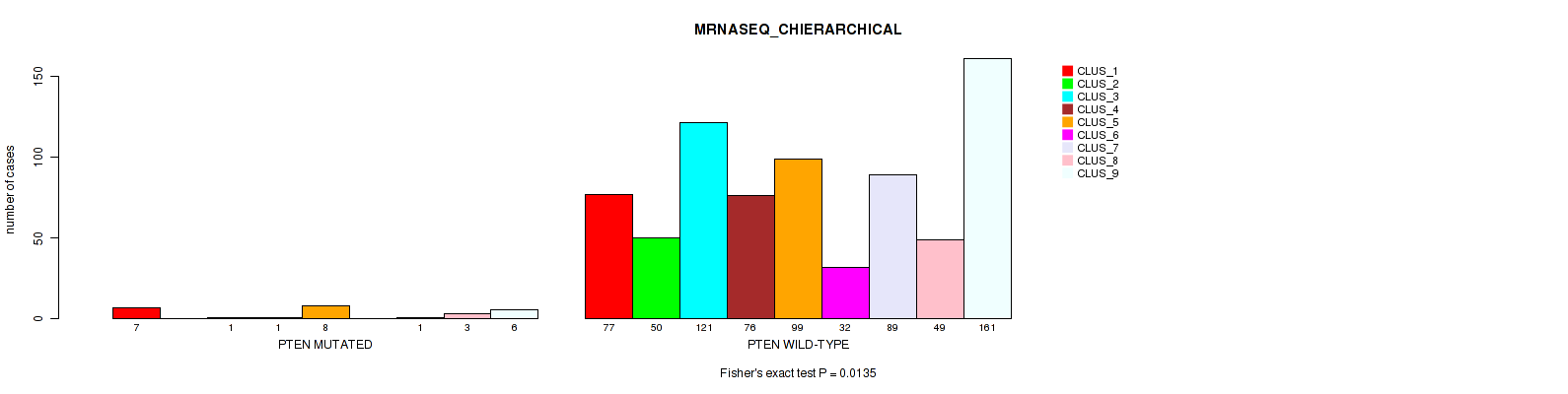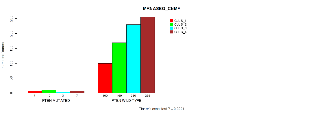 PTEN mutation correlated to 'MRNASEQ_CNMF', 'MRNASEQ_CHIERARCHICAL', and 'MIRSEQ_CHIERARCHICAL'.