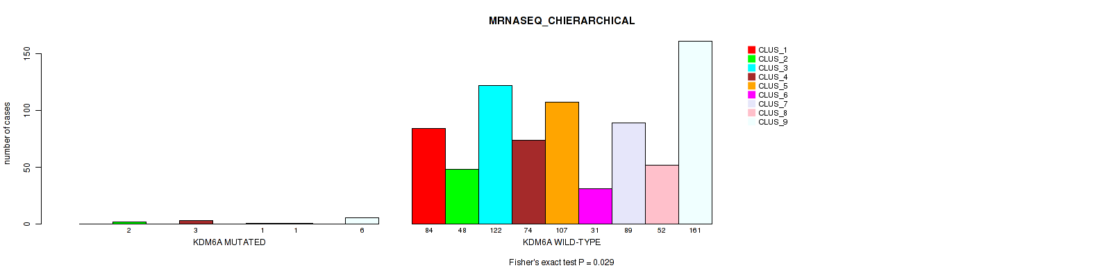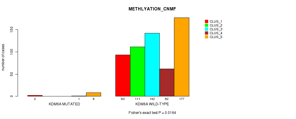 KDM6A mutation correlated to 'CN_CNMF', 'METHLYATION_CNMF', 'MRNASEQ_CNMF', 'MRNASEQ_CHIERARCHICAL', 'MIRSEQ_CNMF', and 'MIRSEQ_CHIERARCHICAL'.