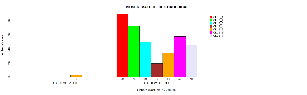 TCEB1 mutation correlated to 'MRNASEQ_CHIERARCHICAL', 'MIRSEQ_CNMF', and 'MIRSEQ_MATURE_CHIERARCHICAL'.